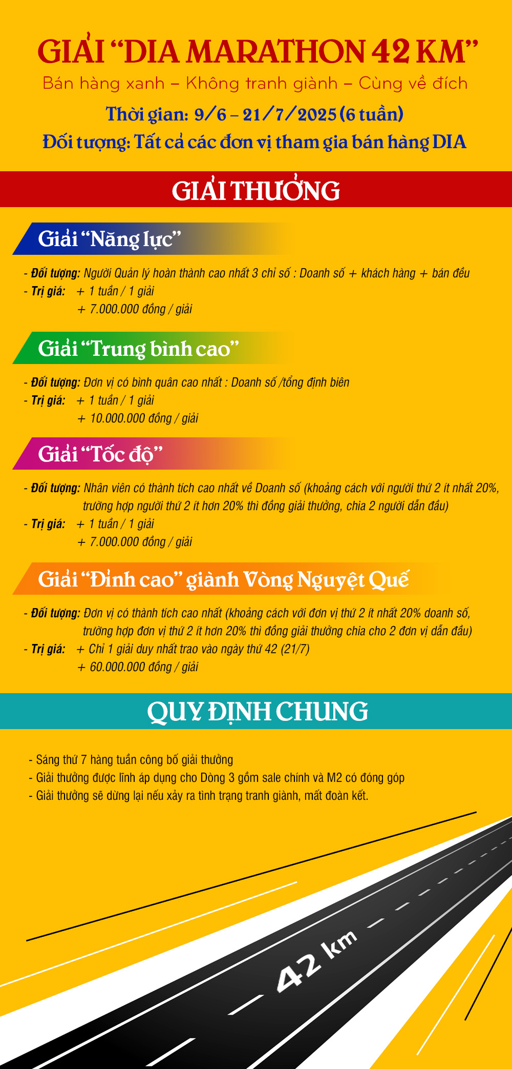 TỔNG KẾT: Giải thưởng DIA Marathon 42km đã chính thức khép lại, Đơn vị PPF T1 và Kam 3 là đơn vị có cá nhân đạt thành tích nhiều nhất trong 6 tuần. Rất tiếc Nội dung thi đấu Chung kết " Giải Đỉnh cao" giành vòng Nguyệt quế trị giá 60 triệu đồng đã chưa "có duyên" với đơn vị nào. Nhưng cánh cửa này đóng lại, lại có cánh cửa khác mở ra, Giải thưởng "DIA Marathon 42km" đã khép lại mang theo sự ghi nhận nỗ lực cố gắng của LĐQL và thành viên của các đơn vị trong thời gian vừa qua. Đồng thời Chiến dịch 100x5V sẽ chính thức khởi động vào ngày 22/7/2025 với nhiều giải thưởng hấp dẫn còn ở phía trước. Hy vọng tất cả các đơn vị tham gia bán hàng DIA sẽ nỗ lực nhiều hơn, làm việc cùng nhau, vui vẻ vượt vất vả, chi viện, hỗ trợ để DIA trở lại mạnh mẽ